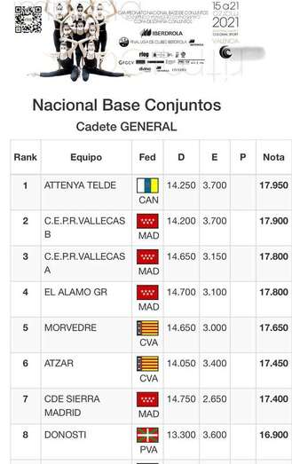 Las primeras en iniciar la competición en la mañana de hoy eran las gimnastas cadetes del Nacional Base de Conjuntos, donde las chicas del Attenya lograban imponerse a los 71 equipos que acudían a esta cita nacional logrando 17.950 puntos. Ocupó la segunda plaza el CPR Vallecas B que logró 17.900 puntos y el CPR Vallecas A, que se clasificaba en tercera posición con 17.800.