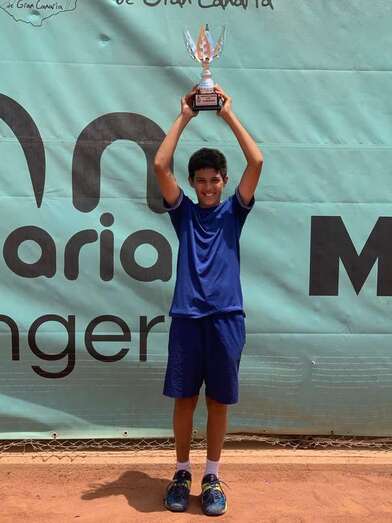 El joven jugador grancanario confirma su trayectoria progresiva, tras ganar numerosas pruebas de circuito nacional de tenis, como el título obtenido el pasado domingo 9 de Mayo, en Sevilla,en el Torneo Warriors Tours.