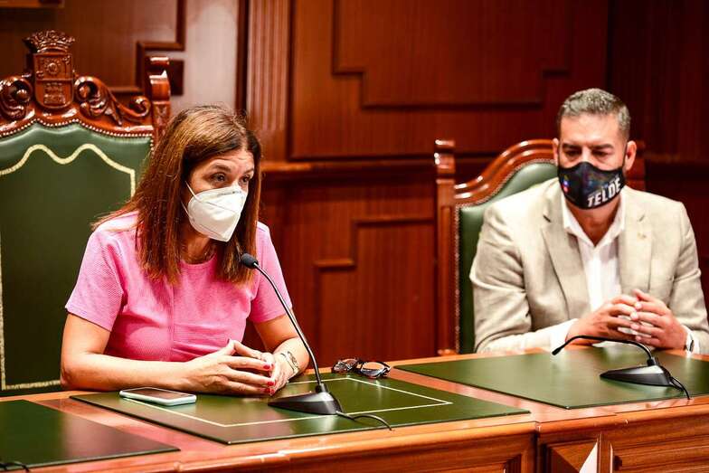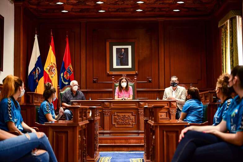 Mañana intensa la que han vivido las jugadoras y el cuerpo técnico del Rocasa Gran Canaria que eran recibidas por la alcaldesa de Telde, Carmen Hernández, acompañada de Diego Ojeda, concejal de Deportes, en el salón de plenos del Ayuntamiento, en la antesala de su debut el próximo sábado en la nueva temporada de la Liga Guerreras Iberdrola visitando al CBM Morvedre.