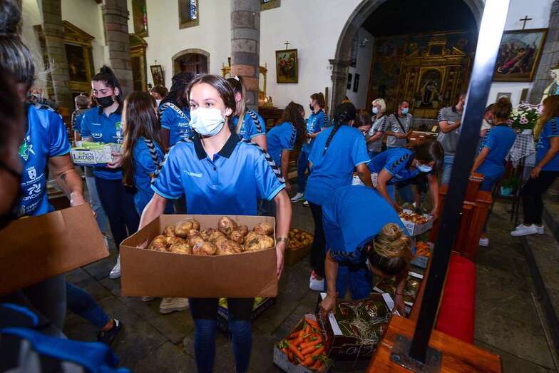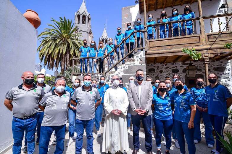 Una vez concluido el sencillo y emotivo acto en el Ayuntamiento, la comitiva del Rocasa Gran Canaria se dirigió a la Basílica Menor San Juan Bautista de Telde, donde fue recibida por el párroco José Cabrera, fiel aficionado de las Guerreras de Telde.