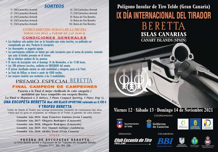 El Club Escuela de Tiro Telde también agradece el apoyo del Gobierno de Canarias, Cabildo de Gran Canaria, Ayuntamiento de Telde, Pegatel Canarias, Aguas de Telde y el principal patrocinador como es BBI, además de Beretta, Benelli Ibérica, así como de las federaciones deportivas.