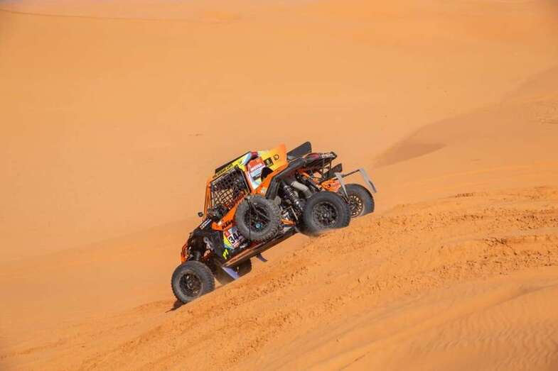 A pesar de la mejora en el coche practicada por los mecánicos de la Expedición Canarias Dakar 2022, los problemas de potencia persistieron por momentos durante la prueba, si bien el equipo espera poder solventarlos del todo esta noche con la nueva válvula de descarga que les espera en el vivac de Wadi Ad Dawasir, las dunas han frenado el ritmo del coche, recuperando el terreno perdido sobre la arena, donde el Side by Side pilotado por Pedro Peñate y guiado por Rosa Romero se ha comportado a las mil maravillas.