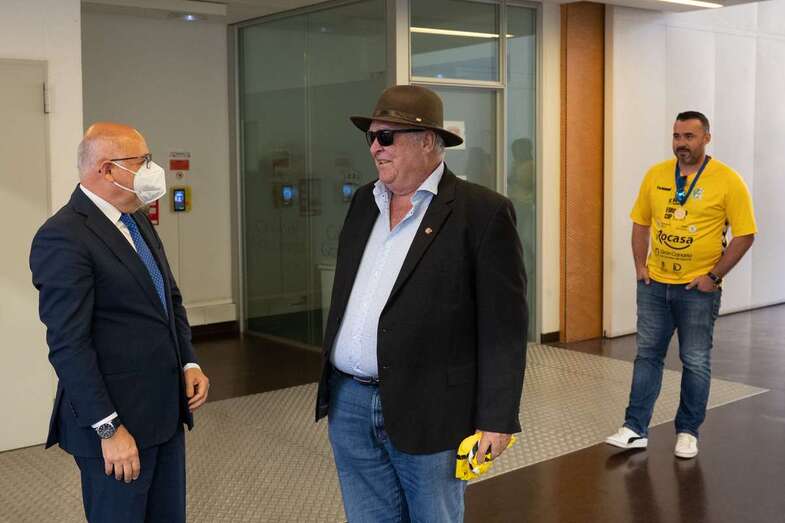 La Casa Palacio del Cabildo de Gran Canaria fue el siguiente punto de encuentro para el equipo entrenado por Robert Cuesta. Allí Antonio Morales, presidente del Cabildo, y Francisco Castellano, consejero de Deportes, dejaron claro lo que significa para la isla tener un referente en el deporte femenino como el Rocasa.