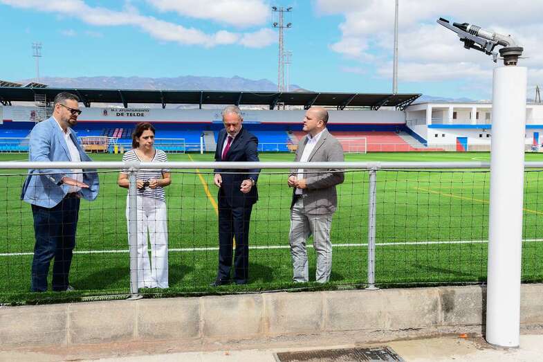 El consejero de Deportes del Cabildo de Gran Canaria, Francisco Castellano, a alcaldesa de Telde, Carmen Hernández, el concejal de Actividad Física y Deportes, Diego Ojeda, y el presidente de la Unión Deportiva Telde, Juan Francisco Morales, visitaron este sábado el