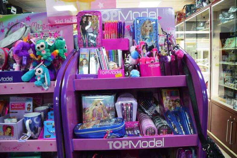 En la sección que Telli destina en su nuevo establecimiento al muestrario de regalos y complementos se puede encontrar asimismo un expositor con bolsos, estuches, set de lápices y rotuladores, bloc de notas, etcétera, de la famosa y selecta marca Top Model.