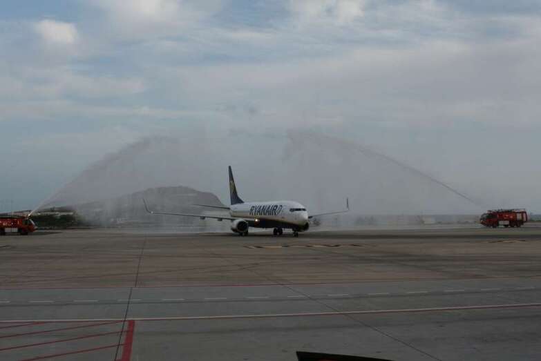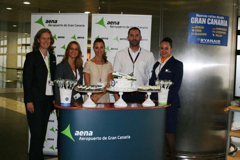 El avión de Ryanair aterrizó en Gran Canaria sobre las 16:45 horas del pasado lunes 31 de octubre y fue recibido con el tradicional arco de agua por los bomberos del aeródromo. Durante la recepción del vuelo, la jefa de Relaciones Externas y Protocolo del Aeropuerto, Teresa Paola Romero, y la jefa de Escala de la compañía, Begoña Bozano Sequeira, entre otros, dieron la bienvenida a los pasajeros y a la tripulación con una tarta conmemorativa.