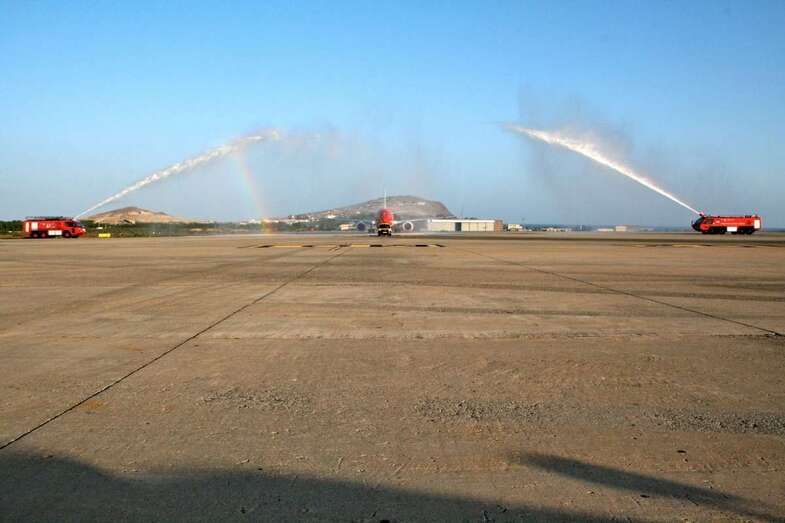 El avión de Norwegian aterrizó el pasado miércoles, 16 de noviembre, en Gando sobre las 17:20 horas, donde fue recibido con el tradicional arco de agua que realizan los bomberos del aeródromo.