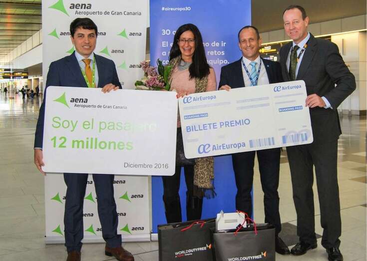 Telde.- La albaceteña Eva Tendero Corredor se convirtió esta mañana en la pasajera 12.000.000 del Aeropuerto de Gran Canaria a lo largo de este 2016 que ya toca a su fin. Una cifra histórica ya que es la primera vez que el aeródromo de Gando alcanza este volumen anual de viajeros.