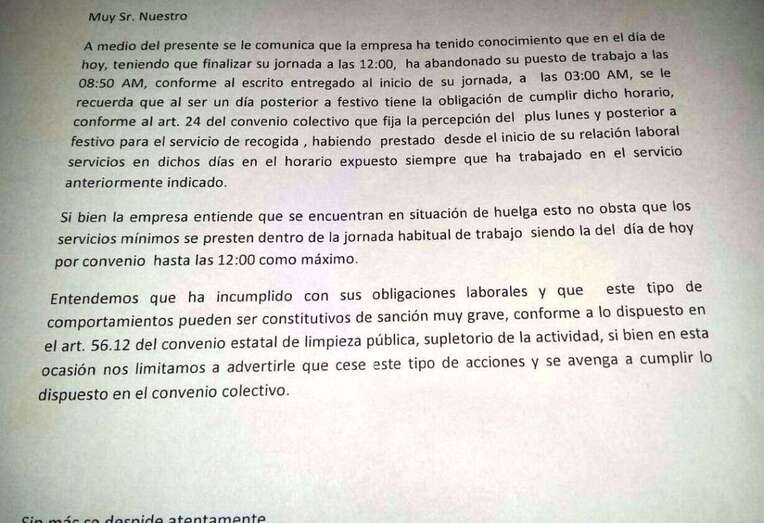 "En esta ocasión, nos limitamos a advertirle que cese este tipo de acciones y se avenga a cumplir lo dispuesto en el convenio colectivo", concluye el escrito empresarial, que ha soliviantado a representantes sindicales y personal de servicio que entienden la advertencia de FCC como una "manifiesta amenaza y coacción".