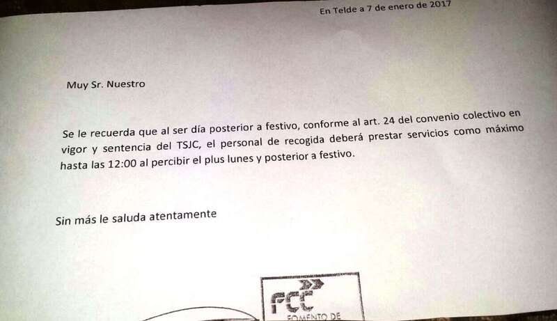 Según ha podido saber TELDEACTUALIDAD de fuentes sindicales, FCC ha remitido escritos a sus empleados en el que les comunica que ha tenido conocimiento de que se ha producido el abandono del puesto de trabajo a las 8.50 horas cuando tenían la obligación de cumplir la jornada hasta las 12.00 horas “al ser un día posterior a festivo”, de acuerdo a lo que estipula el artículo 24 del convenio colectivo que fija la percepción de un plus los lunes y posterior a festivo para el servicio de recogida.