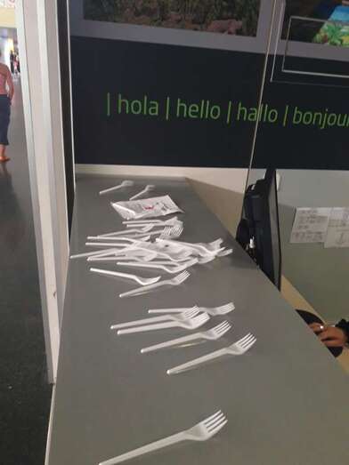 Una iniciativa que consiste en repartir tenedores de plástico para que los viajeros y toda persona que quiera acercarse hasta el Aeropuerto para apoyarles los deposite luego en el mostrador de información de Aena.