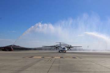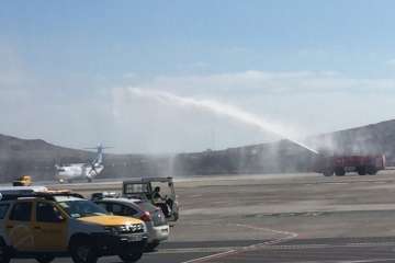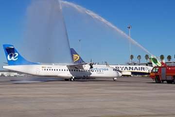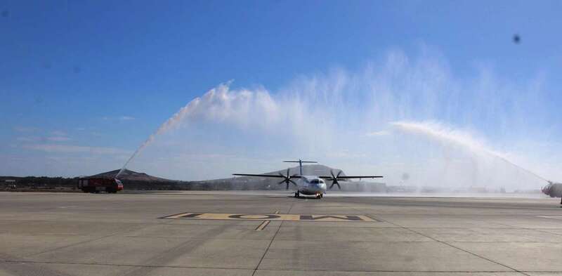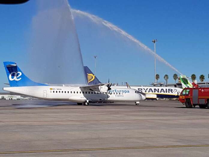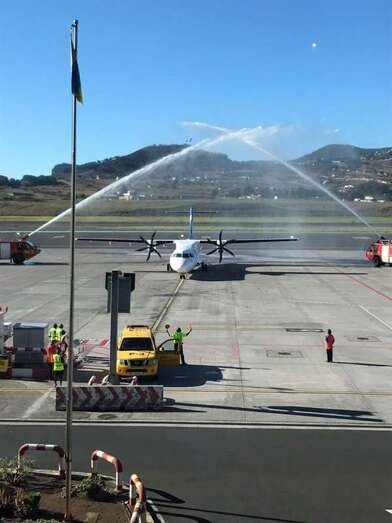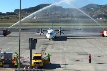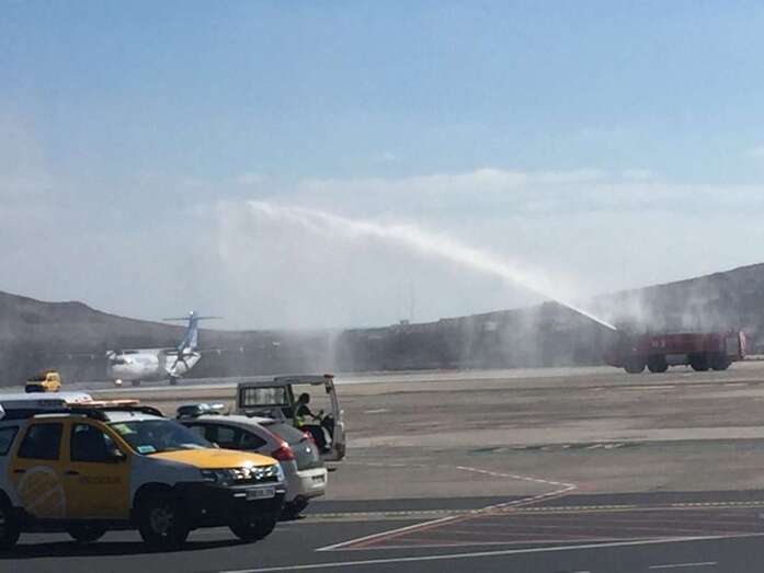 El vuelo inaugural de Air Europa, el UX9415, aterrizó a las 09.23 horas en el Aeropuerto Tenerife Norte, un avión ATR 72-500 procedente de Gran Canaria que recibió el bautizo aéreo desde dos camiones de bombero.