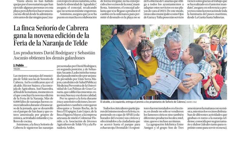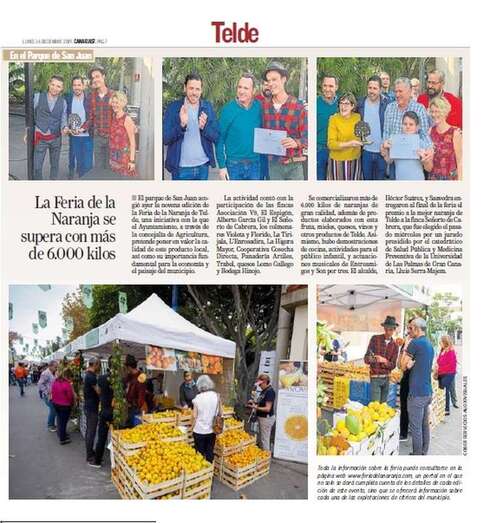 El éxito de esta nueva edición de la Feria de la Naranja ha tenido su reflejo en los principales medios impresos y digitales de la Isla y Canarias. Tanto Canarias7 como La Provincia dedican referencias con fotografías en sus ediciones de papel y electrónica al evento que este domingo pasado tuvo como marco el parque urbano de San Juan.