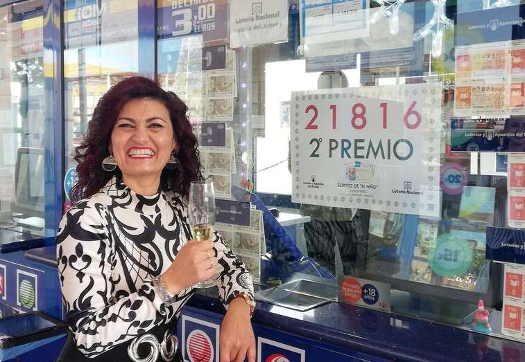 La propietaria de la Administración de Loterías número 10 de Telde, sita en el CC Las Terrazas, muestra su alegría por haber vendido un boleto completo del número 21.816 del Sorteo de El Niño