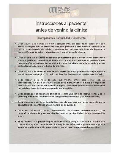 La clínica ha elaborado unas instrucciones para los pacientes que deberán cumplimentar antes de acudir a ella y dentro de sus instalaciones. Pulse aquí para conocer estas instrucciones.