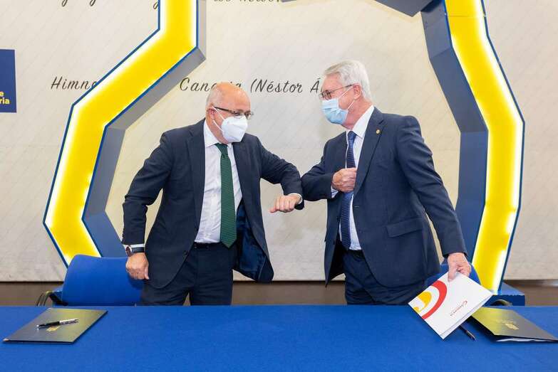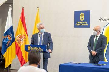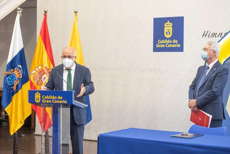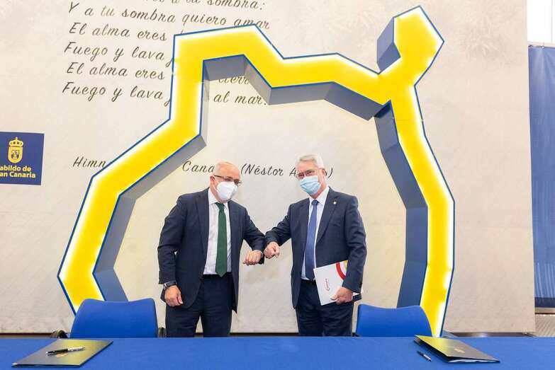 Telde.- El presidente del Cabildo, Antonio Morales, y el de la Cámara de Comercio, José Sánchez Tinoco, firmaron hoy el convenio que permitirá empezar a entregar en junio los 7 millones destinados por la Institución insular a respaldar a locales de restauración y ocio nocturno, así como a centros deportivos y puestos de venta en mercadillos y ferias y que incluyen a los de artesanía al ser sectores afectados de forma constante por las restricciones por la Covid-19.