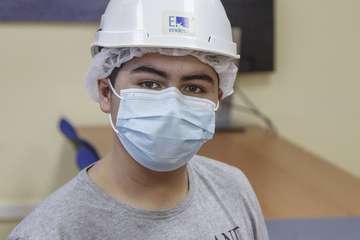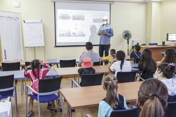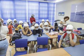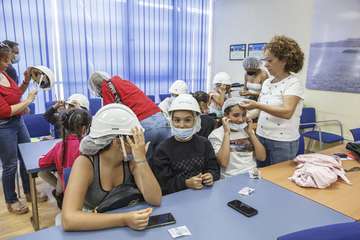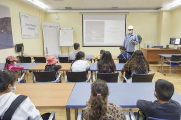 A las 9.00 horas del martes, 19 de julio, el futuro desciende de la guagua que les ha transportado hasta las instalaciones de la central térmica de Endesa en Jinámar. Trenzas, gorras, mochilas, mascarillas y gestos somnolientos. Los quince alumnos, con edades entre 5 y 16 años, participantes en el proyecto promovido por la Fundación Endesa ‘Pasado, presente y “tu-nuestro” futuro’, se topan de frente con una cara simpática y entusiasta procedente del pasado, como a él mismo le gusta presentarse.