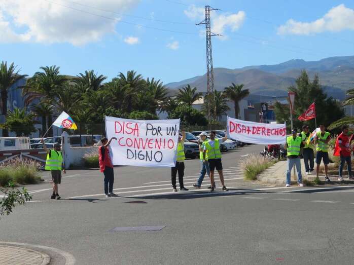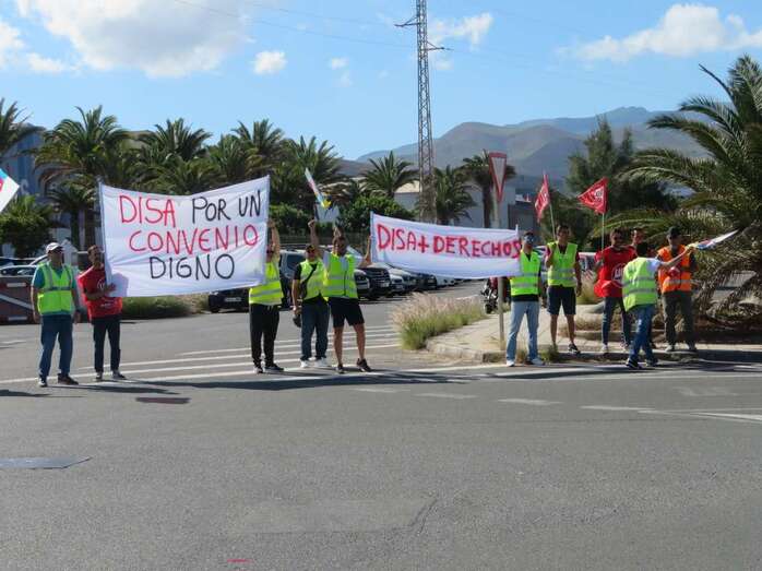 El primer parón tuvo lugar el pasado día 5 y este mediodía volvió a repetirse de 12.00 a 14.00 horas con una ruidosa concentración ante el acceso principal a las instalaciones de Disa en Salinetas. Los huelguistas se hicieron acompañar de una batucada que animó la protesta y llamaron así la atención de los vehículos que transitaban por el vial costero y también de los clientes de Mercadona