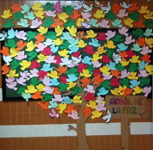 Así, a la hora del recreo los alumnos interpretaron el conocido himno por la paz, leyeron un manifiesto elaborado desde el Proyecto de Igualdad y varios mensajes escritos en inglés, francés y español que colgaban de un alegórico árbol y paloma de la paz.