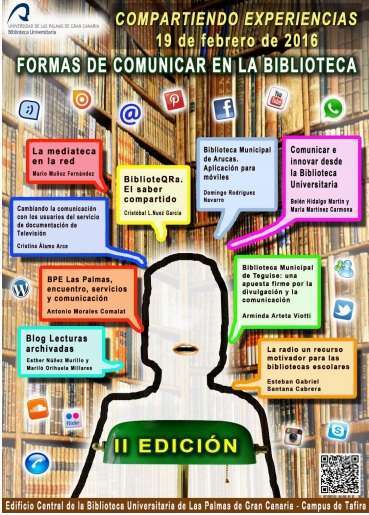 El evento, que se desarrollará entre las 9.00 y las 13.30 horas, será retransmitido en directo y comentado en Twitter utilizando el hashtag #BiblioXperiencia16. Su lugar, la sala polivalente del Edificio Central de la Biblioteca Universitaria (Campus de Tafira). El aforo es limitado.