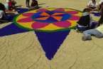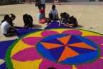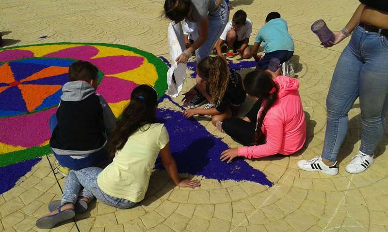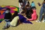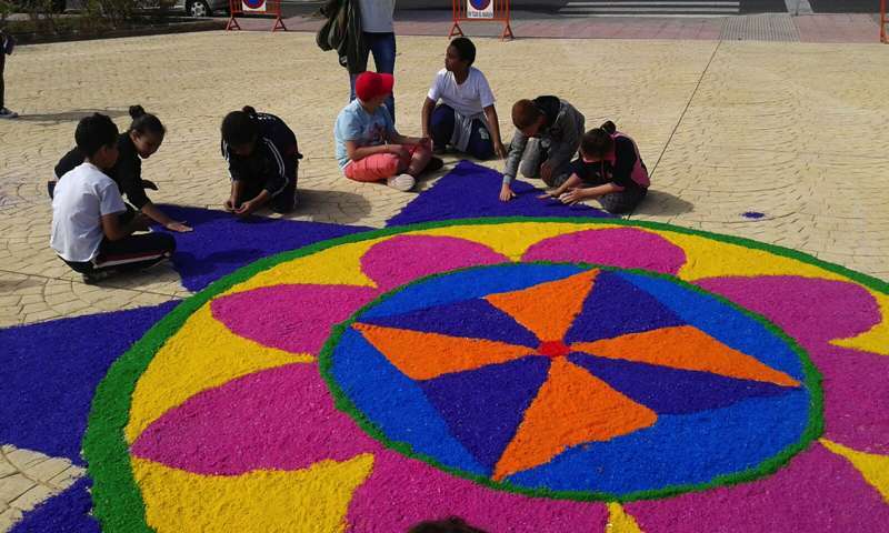 Alumnos y alumnas de los CEIPs Marpequeña, Europa, Saulo Torón, Padre Collado, Plácido Fleitas, Caserones, Príncipe de Asturias y Valsequillo, el IES Jinámar y el CEO Omaira Sánchez participaron en los talleres organizados por el área de Solidaridad que dirige Marta Hernández y otros departamentos municipales y elaboraron un rangoli gigante –dibujo en el suelo- con sal de colores como muestra de unión de Telde con el pueblo indio.