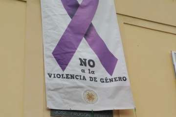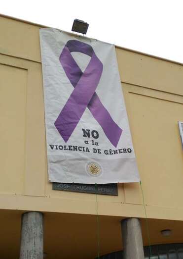 Cartel-pancarta contra la violencia machista en la fachada principal del centro (Foto TA) Cartel-pancarta contra la violencia machista en la fachada principal del centro (Foto TA)
