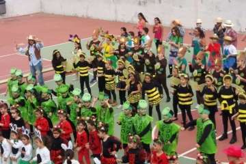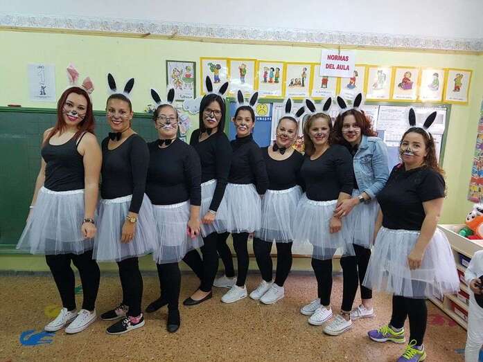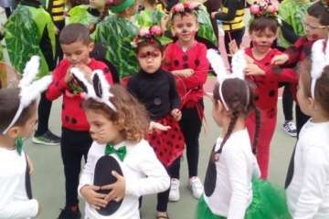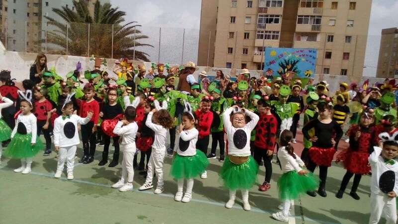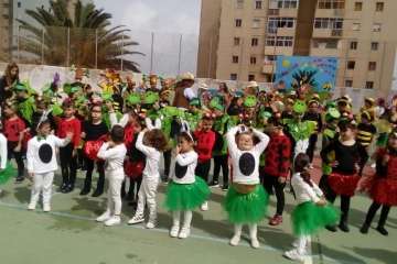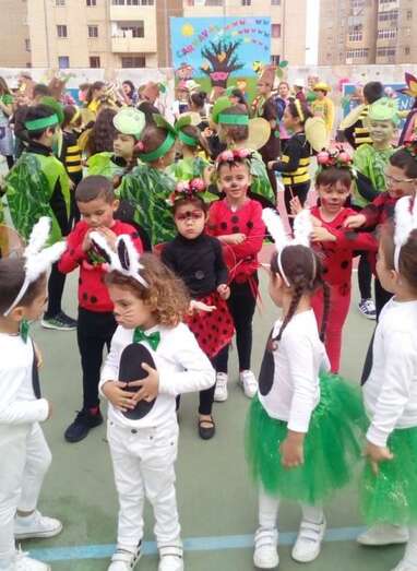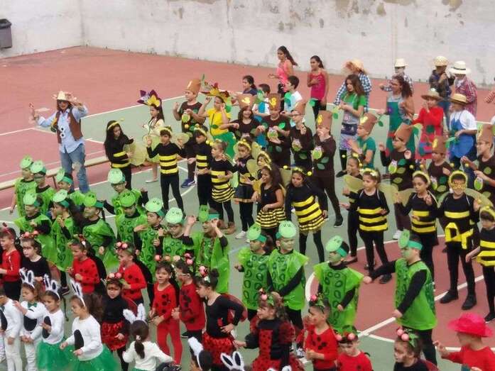 Alumnos, profesores y padres y madres disfrutaron a primera hora de un desayuno carnavalero con tortitas y chocolate caliente, así como de actuaciones musicales de cada curso disfrazados de conejitos, mariquitas, tortugas, abejas, árboles, flores, espantapájaros y jardineros, todos los disfraces elaborados con colaboración de las familias participantes.