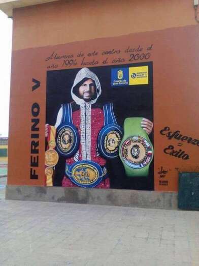 El púgil, campeón de Europa welter, regresaba ayer al que fuera su colegio durante seis años, el CEIP Juan Negrín de Las Remudas, para asistir a un bonito homenaje. La inauguración de un mural suyo que ha realizado el artista Fabrizio Vittorini gracias al apoyo económico del Cabildo grancanario.