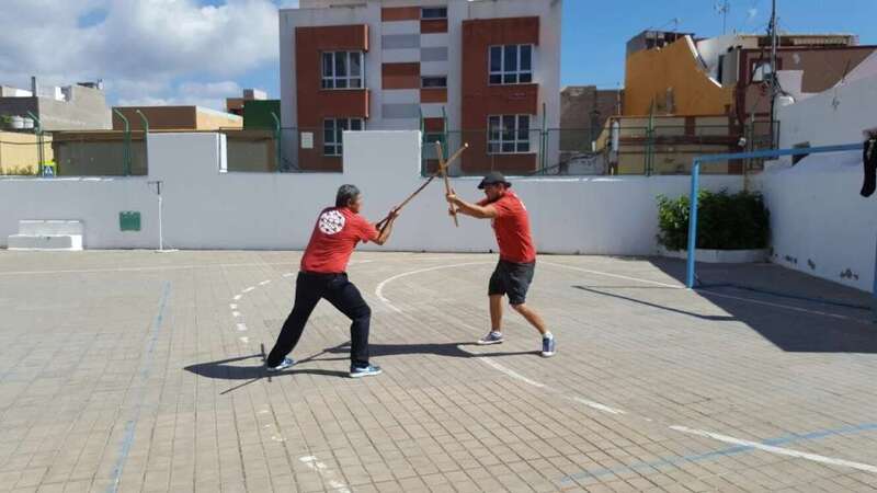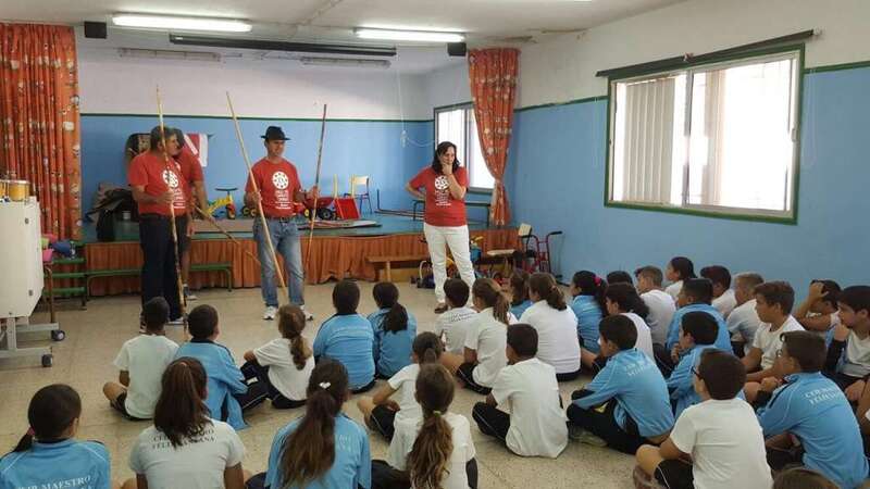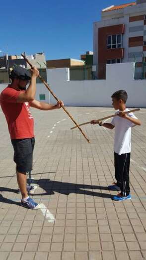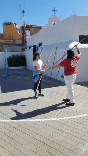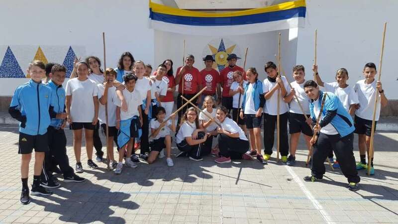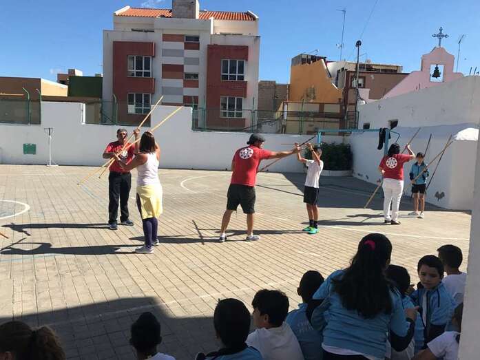 Los escolares asistieron en primer lugar a un taller del Juego del Garrote, impartido por Ana y Juanito, hijos del desaparecido Maestro Paquito Santana, junto a otros colaboradores, algunos también familiares del maestro.