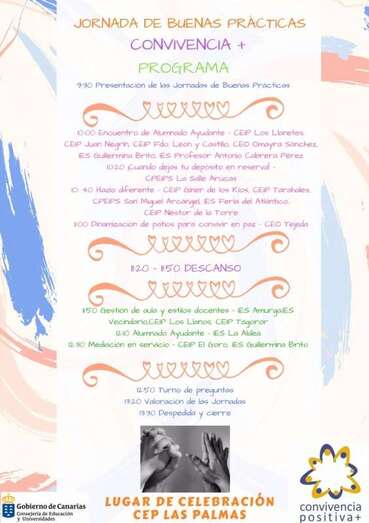 Durante este encuentro insular el profesorado trabajará en acciones de fomento de la convivencia positiva, compartiendo los proyectos y experiencias que han llevado a cabo a lo largo de este curso escolar en materia de  convivencia: proyectos de mediación, de gestión en el aula, alumnado ayudante y dinamización de patios son algunas de las experiencias que los docentes compartirán durante la jornada.