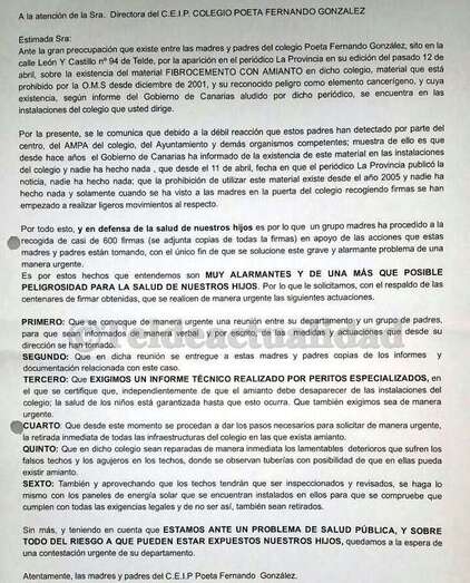 Telde.- Más de 620 firmas de padres y madres de alumnos del colegio Poeta Fernando González de Telde piden la retirada urgente de los restos de amianto que aún persisten en este centro educativo de San Juan.