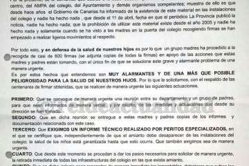 En un escrito que este miércoles un grupo de padres y madres ha presentado ante el registro del Ayuntamiento de Telde, y que también han dirigido al Gobierno de Canarias y a la dirección del propio colegio, tachan de “débil reacción" la respuesta que desde el Consistorio, el AMPA, la dirección del centro y demás organismos competentes se ha dado a este asunto, que consideran un grave problema de salud pública, del que el Gobierno de Canarias había alertado hace años sin que hasta la fecha se haya hecho nada para remediarlo, aseguran. “Solamente cuando cuando se ha visto a las madres en la puerta del colegio recogiendo firmas se han empezado a realizar ligeros movimientos al respecto”, apuntan en el documento.