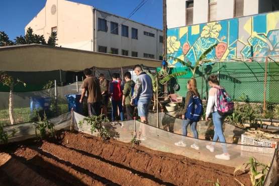 Allí, en el espacio cultivado entre el Centro Cívico y el inmueble de la cerrada Escuela Infantil Municipal, los estudiantes se instruyeron sobre los cultivos de berenjenas, calabacines y fresas, cómo cuidar el huerto día a día y cómo prepararlo para el período de siembra o para saber dónde se van a plantar los próximos frutales en su zona.