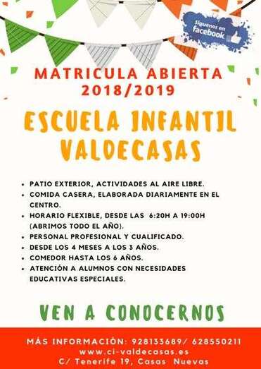 Telde.- La escuela infantil privada Valdecasas, situada en la calle de Tenerife, ha abierto ya la matrícula para el nuevo curso escolar 2018-2019.