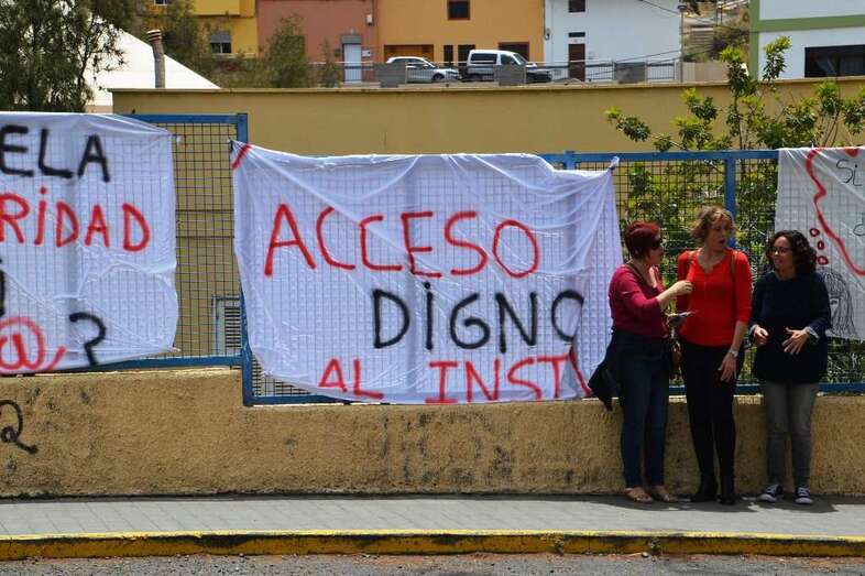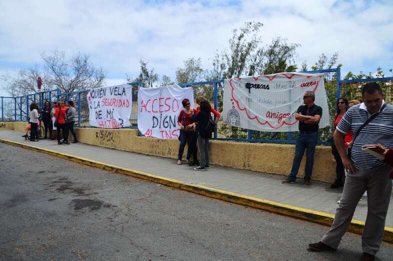 Un decenio lleva el instituto reclamando medidas de seguridad que elimine el peligro diario que sufre sus alumnos. Hoy los padres no aguantaron más y se personaron en el único y empinado acceso al centro para vehículos y desplegaron varios pancartas para mostrar su malestar por la dejación de las autoridades públicas para poner remedido a esta situación.
