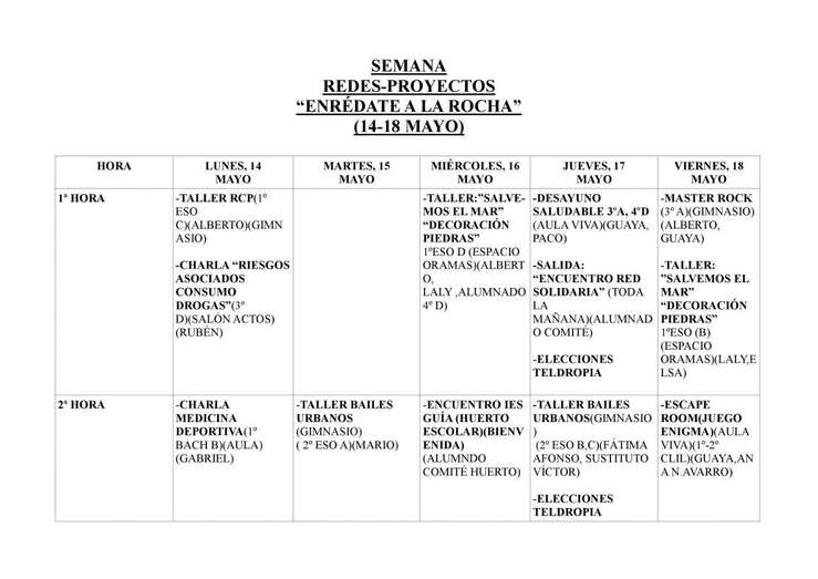 Telde.- El IES teldense José Frugoni Pérez llevará a cabo esta semana, del lunes 14 al viernes 18 de mayo, el ciclo de actividades Enrédate a La Rocha, con charlas, talleres, cine, exposiciones, exhibiciones, balonmano y flag football.