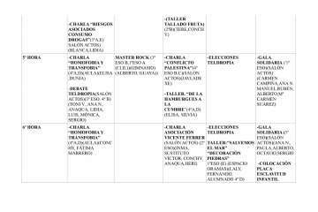 Las charlas trataran temas diversos como el conflicto de Palestina, homofobia, consumo y drogas, prevención de accidentes, machismo justicia y educación.  Asimismo participara la Fundación Vicente Ferrer y el escritor Luis Perez Aguado.