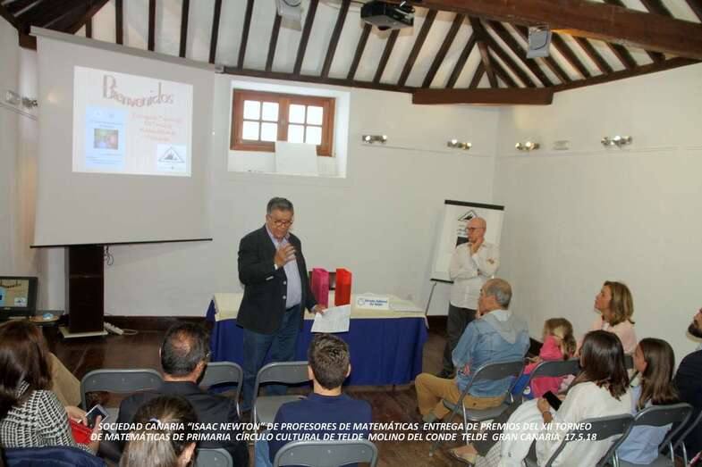 La tarde del jueves 17 de mayo tuvo lugar en el Molino del Conde, sede del Círculo Cultural del Telde, la entrega de los Premios del XII Torneo de Matemáticas de Primaria que concede la Asociación Canaria “Isaac Newton” de Profesores de Matemáticas, Medalla de Oro de Canarias. Acto que coordina, el profesor D. Arístides Ramírez Martel, presenta el presidente del Círculo Cultural de Telde, Máximo Riol Cimas.
