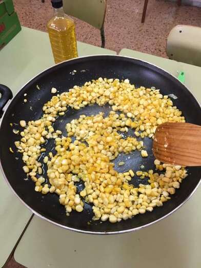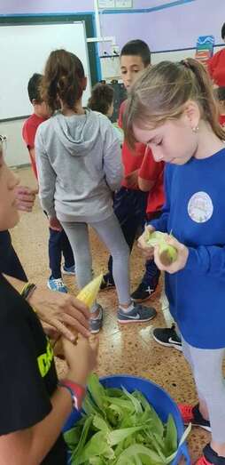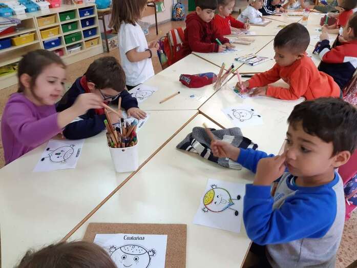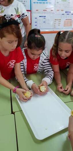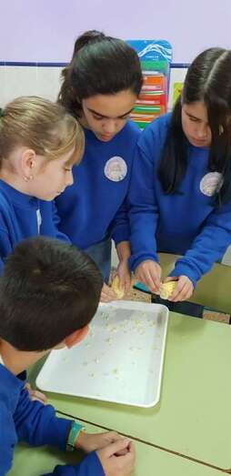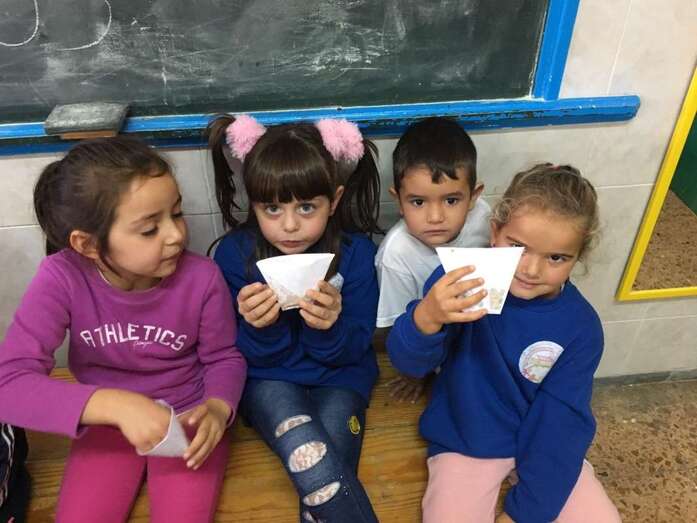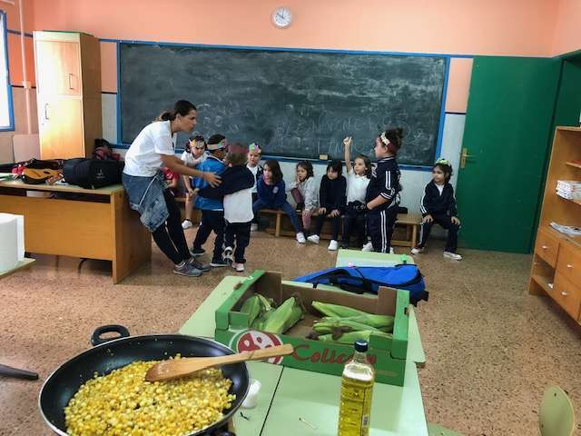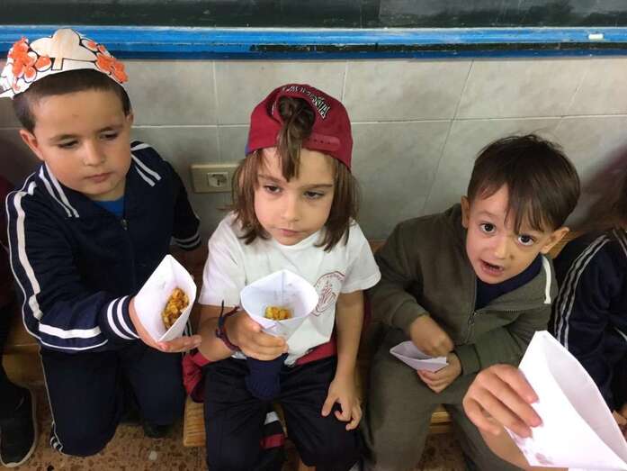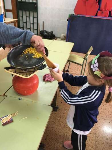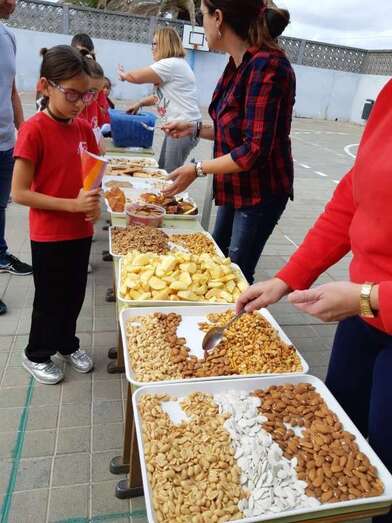 Después de los talleres, el alumnado recuperó fuerzas con un gran desayuno en el que no faltaron las castañas asadas (aportadas por el CER y que el profesor Tonono se encargó de pasar por el fuego) y los productos de otoño aportados por las familias: manzanas, almendras, pistachos, pipas, nueces, galletas, etc.