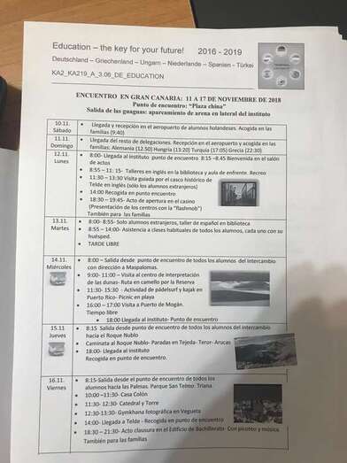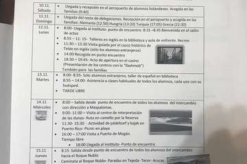 Desde el instituto de Telde se han preparado toda una serie de actividades culturales, talleres, debates y excursiones a Las Palmas de Gran Canaria o Maspalomas. Este lunes, por ejemplo, tuvo lugar el acto de apertura del encuentro en el salón de actos del centro, una ceremonia a la que acudieron profesores, alumnos y padres y madres, así como otros miembros de la comunidad educativa. Todos los grupos se presentaron a través de un flashmob. Y en la jornada de hoy se llevaron a cabo diversos talleres de música, castellano, etc.