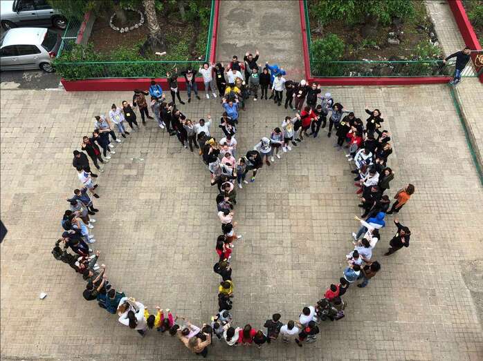El acto central tuvo lugar en el salón de actos e incluyó actuaciones musicales. Para finalizar, la comunidad educativa representó en el patio el símbolo de la paz.