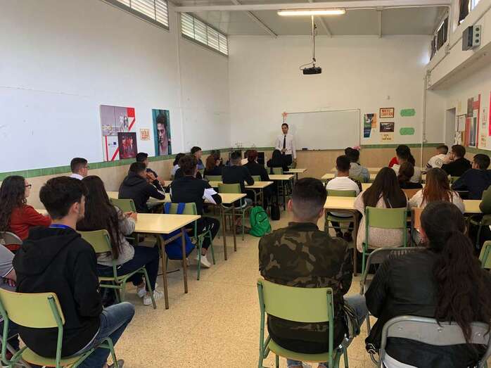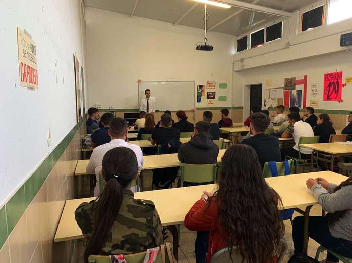 Josep Bordón, psicólogo de empresa y salud que dirige el área de Recursos Humanos y el departamento Tecnológico de la Farmacia La Herradura y Parafarmacias Eliben Sugar S.L., expuso durante algo más de dos horas a los treinta y tres alumnos y dos docentes que participaron en esta actividad diferente cuestiones relacionadas con el entorno laboral.