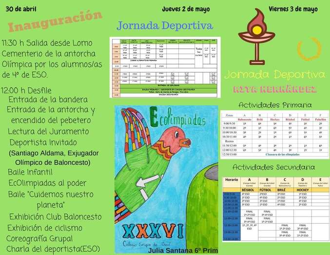Ayer tuvo lugar la ceremonia de inauguración. La antorcha olímpica salió en una marcha de alumnos de 4º de la ESO desde Lomo Cementerio y luego, ya en centro, tuvo lugar el encendido del pebetero y la lectura del juramento, acto en el que el deportista invitado fue el exjugador de baloncesto Santiago Aldama, que jugó en el Gran Canaria y que participó en los Juegos Olímpicos de Barcelona 92.