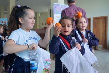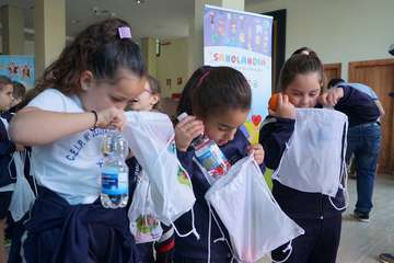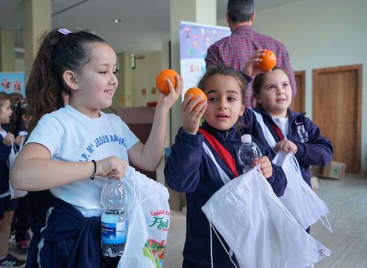 Tras finalizar el espectáculo, se reparte entre los escolares sus gymsacks de desayuno saludable, con fruta, agua y gofio.