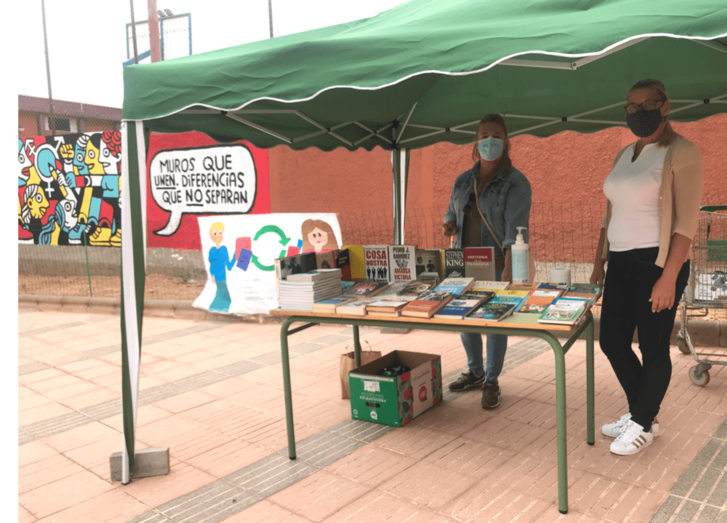 El intercambio de libros por alimentos se realiza en un pequeño stand ubicado en los exteriores del instituto, en la calle Roberto Koch de El Calero.