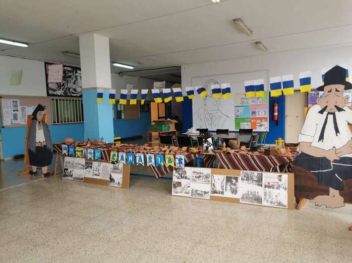 De ahí dimos continuidad al trabajo de Canarias, una degustación típica (bocadillo de chorizo Teror o queso semi, plátanos, chocolatinas Tirma, agua de Teror, y Clipper de fresa), respondamos y en el patio la soga, el elástico, el trompo, la sillita, el pañuelo, el teje, la lucha canaria, la artesanía y los bales tradicionales junto con la música folclórica.... Armonizaron la jornada escolar. Acabamos presentando en el salón de actos el video completo ganador del concurso.