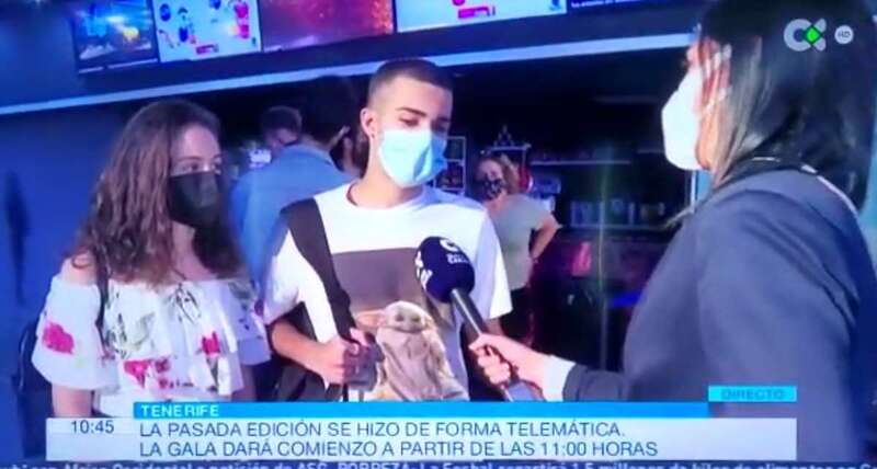 Gabriel López, director del corto, y Verónica Franco, ambos guionistas y actores, junto al Salvador Silva, profesor coordinador, recogieron la que, hasta ahora, representa la decimotercera distinción que recibe nuestro centro, y atendieron también a la TV Canaria en el directo de la entrada a la Gala.
