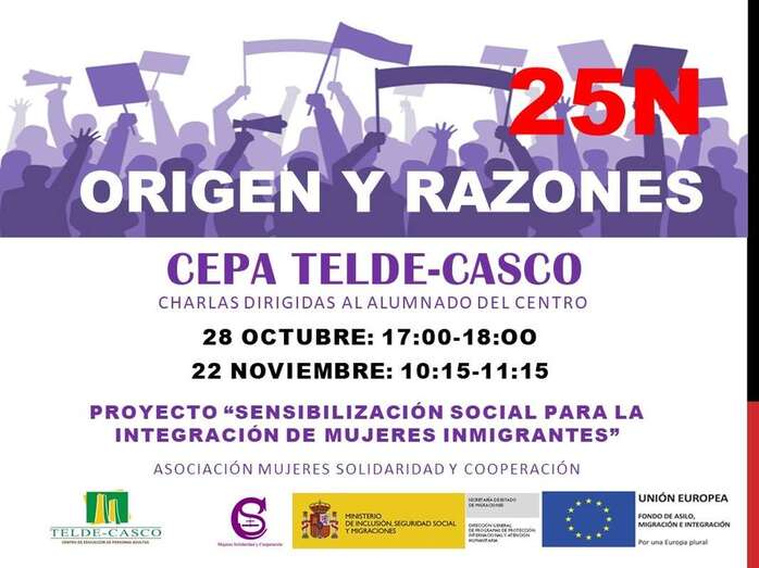 El CEPA impartirá dos charlas a su alumnado, el 28 de octubre (de 17.00 a 18.00 horas) y el 22 de noviembre (de 10.15 a 11.15 horas) sobre el origen y las razones del 25-N.
