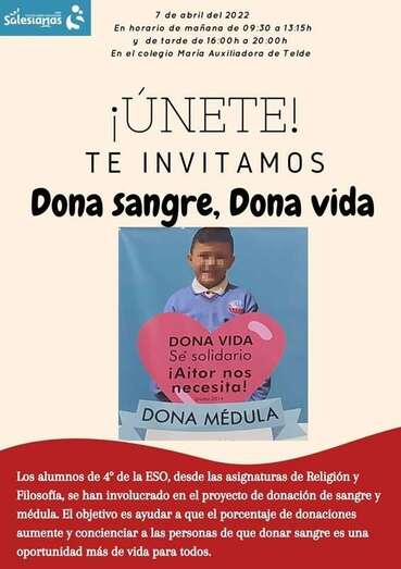 La campaña, que está organizada por alumnos de 4º de la ESO, con el fin de poder colaborar con una causa tan importante como la de donar sangre y también concienciar sobre la necesidad de hacerse donante de médula, está dirigida a su compañero Aitor, un niño de 8 años que padece mielodisplacia, una enfermedad relacionada con la sangre.