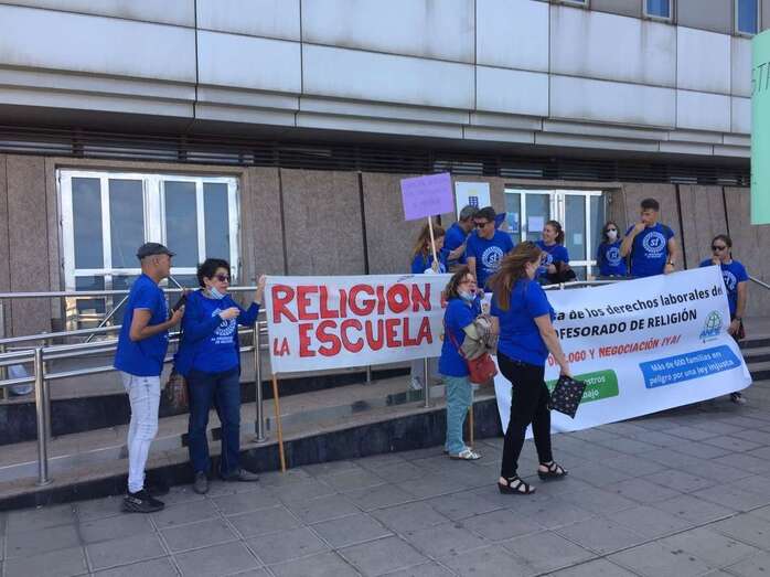 Docentes teldenses de Religión participaron este miércoles en la protesta llevada a cabo ante la sede de la Consejería de Educación en la capital grancanaria para exigir respeto para el profesorado de esta materia en los centros educativos.